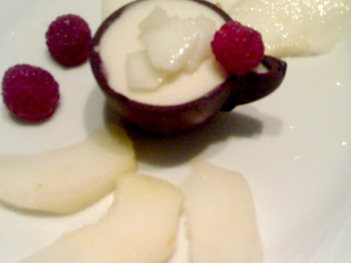 Un dessert per la domenica. mousse di pere in tazzine di cioccolato.
