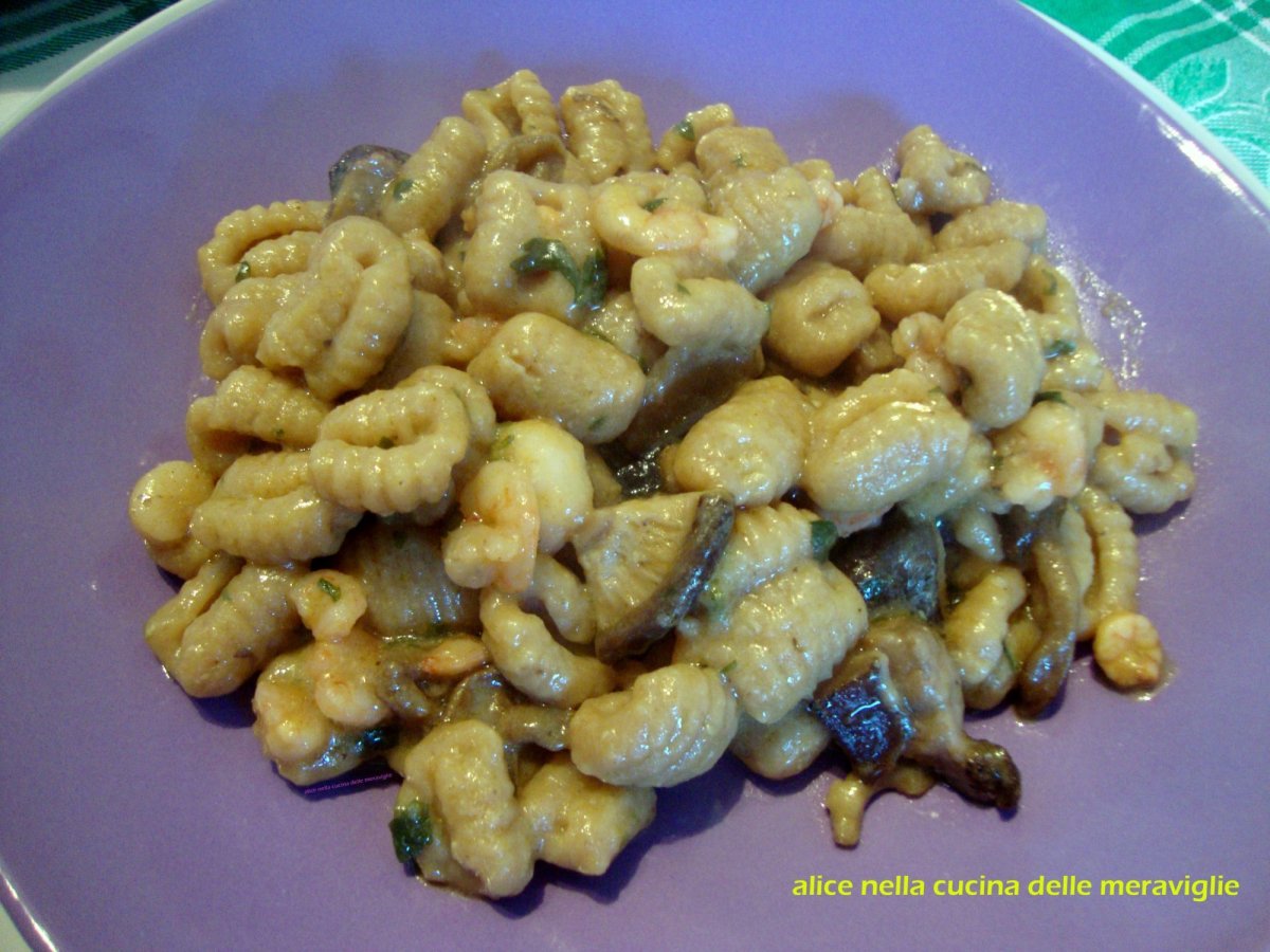 Questi gnocchetti sono nati dalla curiosità di provare la pasta fresca fatta con la farina di ceci, poi però non sapevo come abbinarli o meglio, dopo tanta fatica volevo un degno “accompagnamento”; allora ho dato un’occhiata alle “scorte” ma, gli estivi gamberetti erano pochi così ho dato un tocco autunnale aggiungendo i funghi. Il risultato? Spettacolari!