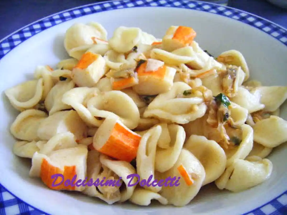 Orecchiette con vongole e surimi Portata principalefacile35 min Invia questa ricetta ad un amico Stampa la ricetta Contatta l'autore della Ricetta Pubblica la foto di questa ricetta Ingredienti 5 500 g di orecchiette 1 confezione di vongole surgelate 200 g di surimi surgelato 1 bicchiere di vino bianco 3 cucchiai di succo di limone paprika sale olio d'oliva prezzemolo 1 spicchio d'aglio