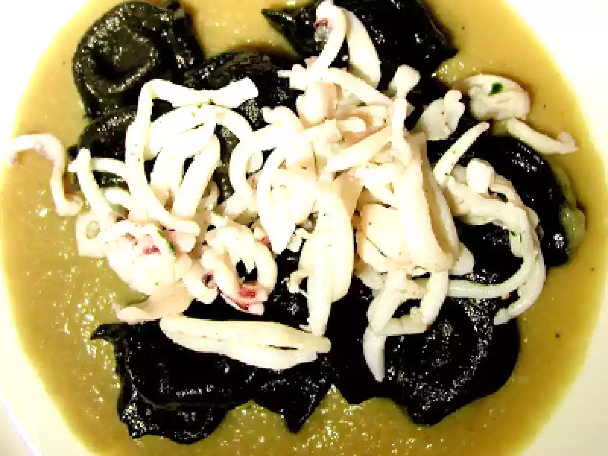 Plin di capra su crema di carciofi con calamari scottati vota adesso Portata principalefacile50 min599 Kcal Invia questa ricetta ad un amico Stampa la ricetta Contatta l'autore della Ricetta Pubblica la foto di questa ricetta Ingredienti 2 Per la salsa di carciofi : 1 spicchio aglio 150 g fondi carciofi già puliti limone sale olio extravergine di oliva parmigiano reggiano grattugiato Per il ripieno di formaggio : 100 g ricotta vaccina asciutta 70 g caprino fresco pepe nero 1 foglia basilico Per i calamari : 200 g calamari limone alloro sale pepe olio extravergine di oliva prezzemolo Per li olio aromatizzato all'aglio e rosmarino : olio extravergine di oliva aglio rosmarino