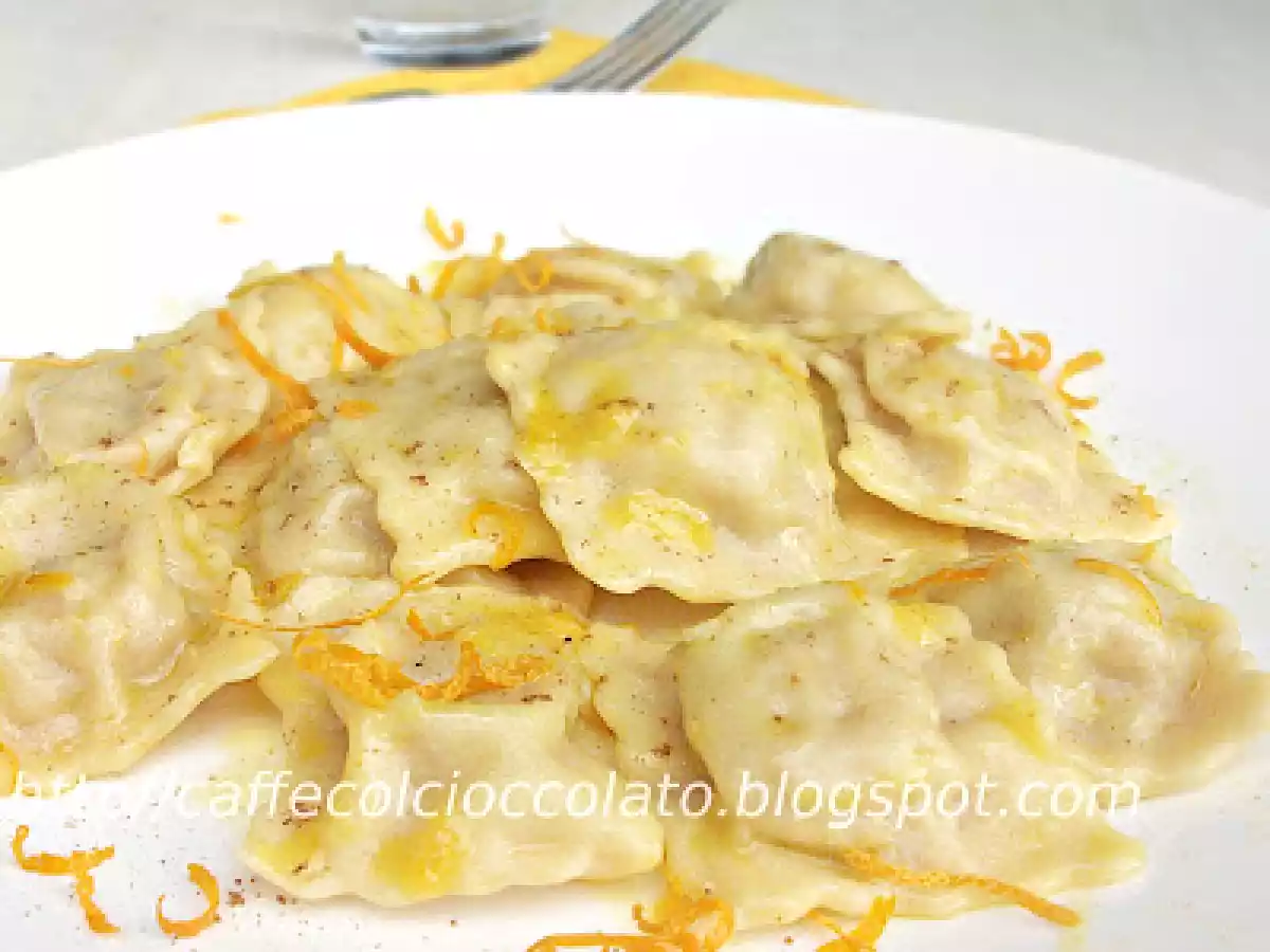 Ravioli di magro all'arancia vota adesso Portata principalefacile50 min Invia questa ricetta ad un amico Stampa la ricetta Contatta l'autore della Ricetta Pubblica la foto di questa ricetta Ingredienti 4 per la pasta : 250 grammi di farina 2 uova più un tuorlo per ripieno e condimento : 400 grammi di sedano rapa 2 arance non trattate un limone 40 grammi di pecorino romano 60 grammi di gherigli di noce mezzo bicchierino di calvados 40 grammi di burro pepe nero sale
