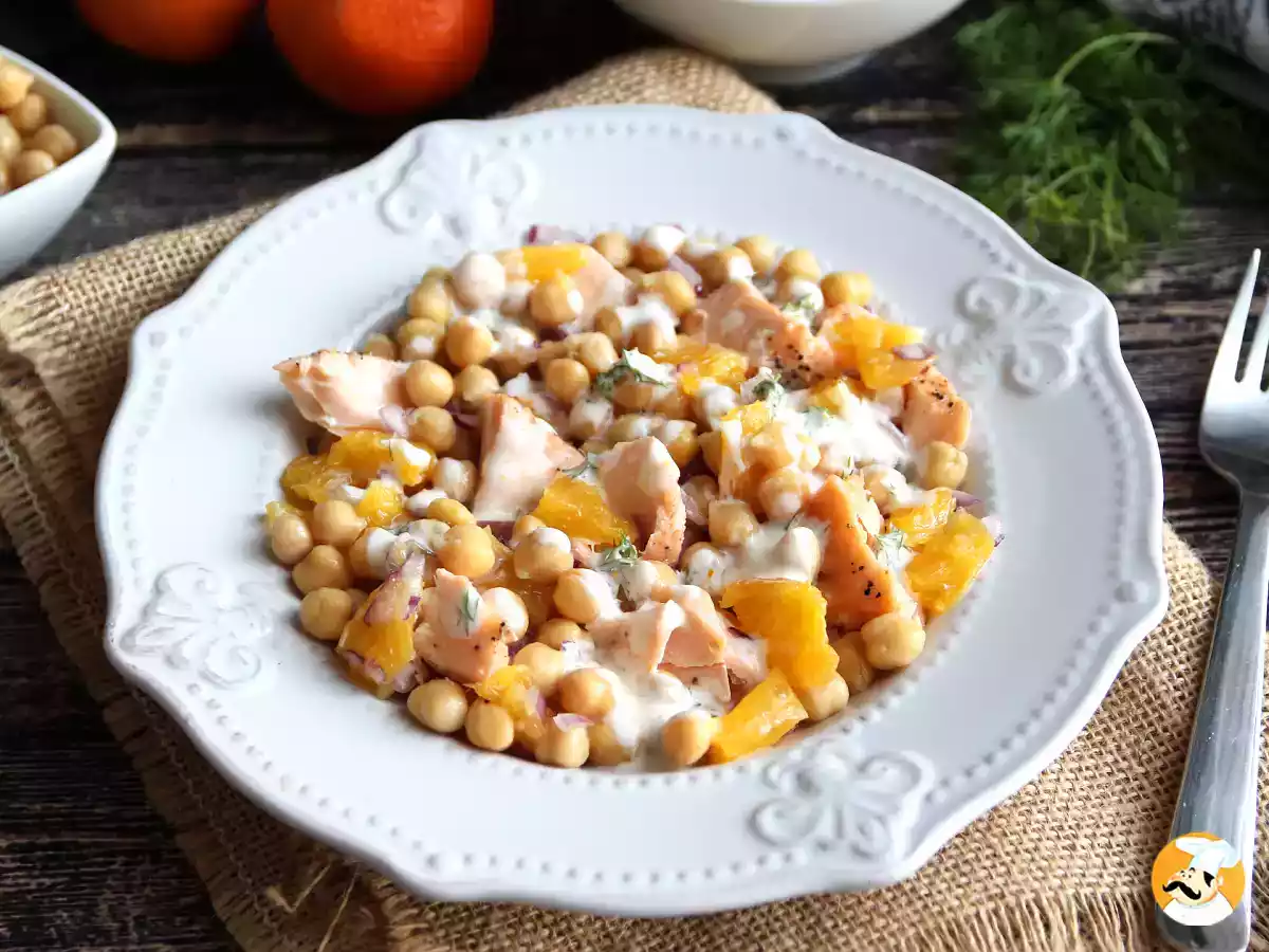 Se cuoci il salmone al microonde sarà pronto in 4 minuti, i ceci puoi usare quelli in scatola già cotti, poi dovrai sbucciare un'arancia e tagliare a fettine una cipolla. Ecco la nostra velocissima insalata: gustosa e nutriente. Ottima idea per una cena sfiziosa!