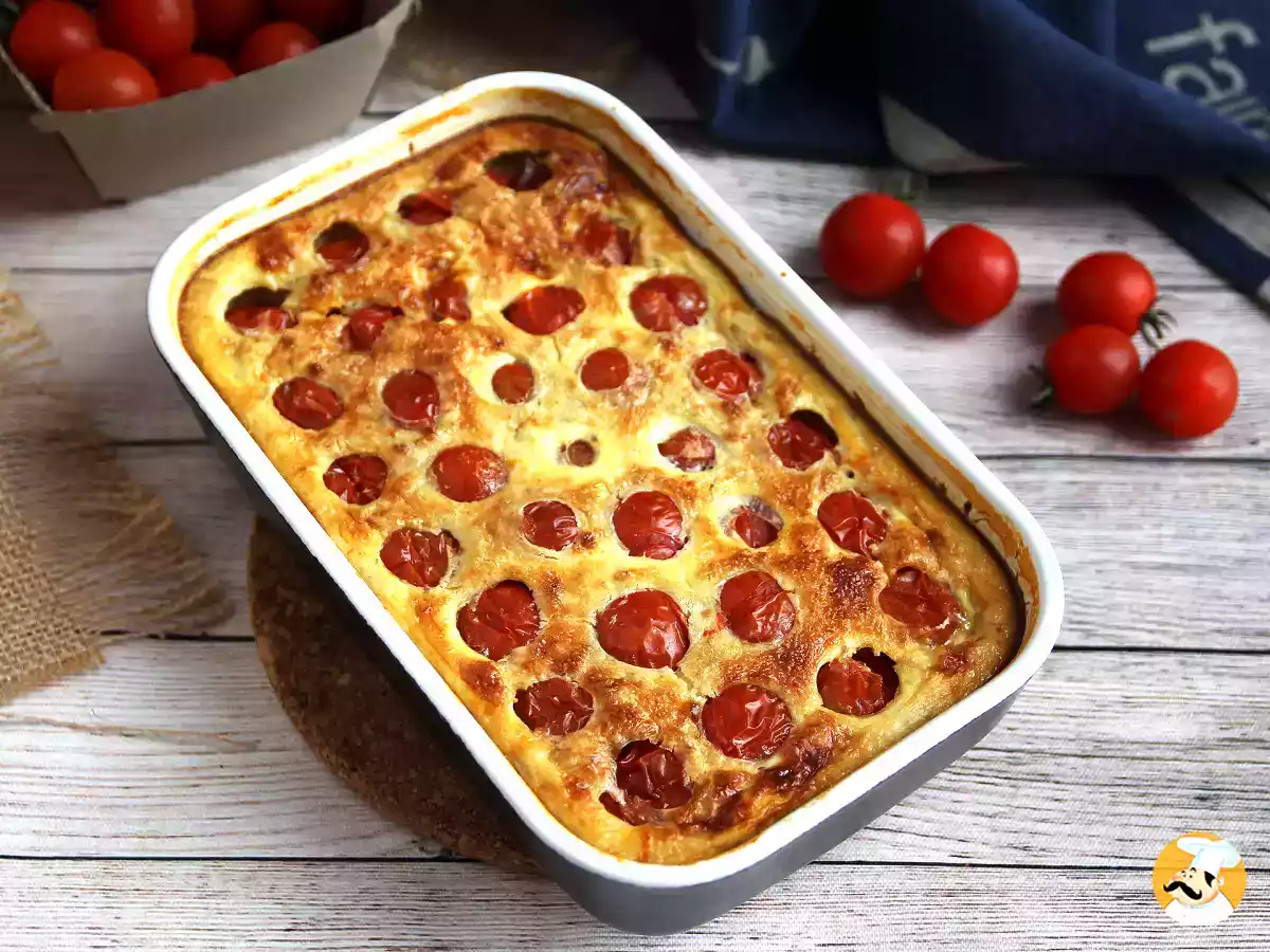 Sicuramente avrai già sentito parlare del clafoutis alle ciliegie, uno dolce squisito della pasticceria francese. Qui ti proponiamo, invece, una versione salata che si prepara in men che non si dica: le ciliegie vengono sostituite con i pomodorini per dare lo stesso effetto del dessert transalpino, poi nella nostra ricetta salata abbiamo aggiunto de l tonno al naturale (che avrai sicuramente in dispensa). Prova questo piatto salva cena, è pronto in meno di 40 minuti!