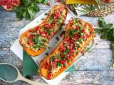 La zucca, morbida e dolce, è perfetta come base per una farcitura ricca e gustosa. La quinoa, fonte eccellente di proteine vegetali e fibre, aggiunge consistenza e una nota di freschezza che si sposa magnificamente con la dolcezza della zucca. Ma ciò che rende davvero unico questo piatto è il melograno, che non solo dona una vivacità di colore e un sapore leggermente acidulo, ma è anche considerato un ingrediente portafortuna per il Capodanno.