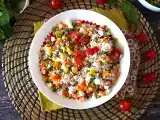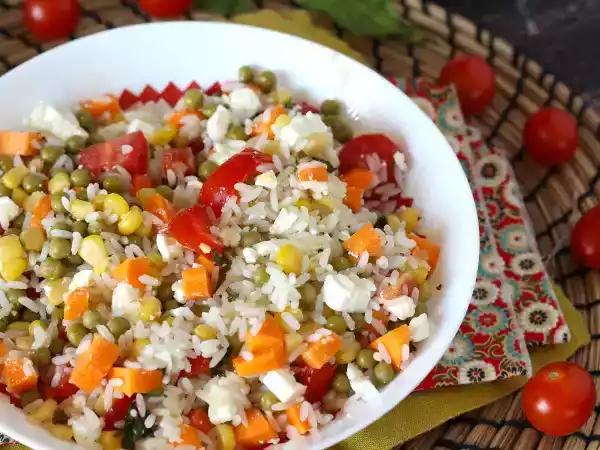 Per preparare questa i nsalata di riso abbiamo utilizzato feta, mais, carote, piselli, pomodorini e menta. L'idea era quella di utilizzare tutti ingredienti che non vanno cotti (a parte il riso, ovviamente), l 'abbinamento di sapori è davvero azzeccato. Provatela subito!