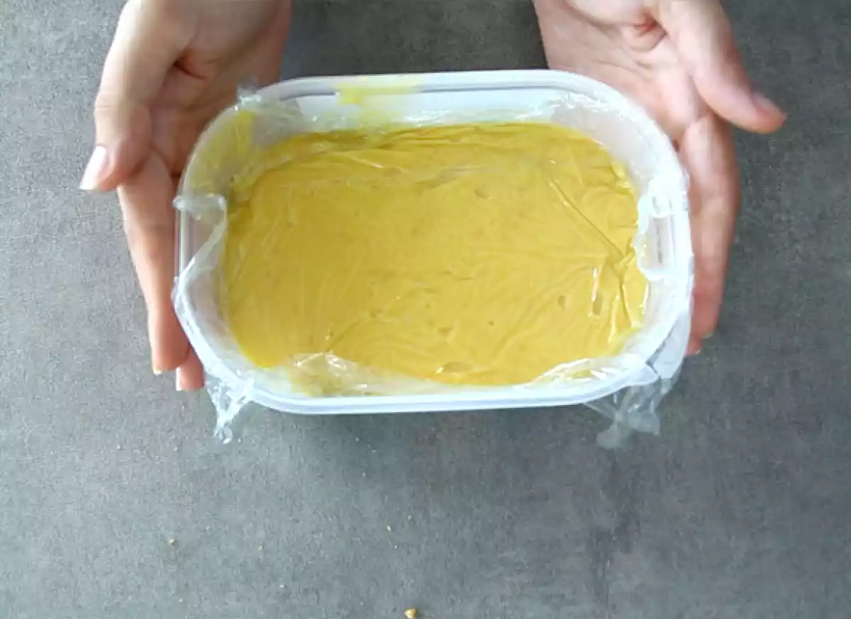 Mescolare la purea di mango con la base raffreddata. Versare il composto in una vaschetta da gelato, coprire con pellicola a contatto e riporre in congelatore per almeno 3 ore.