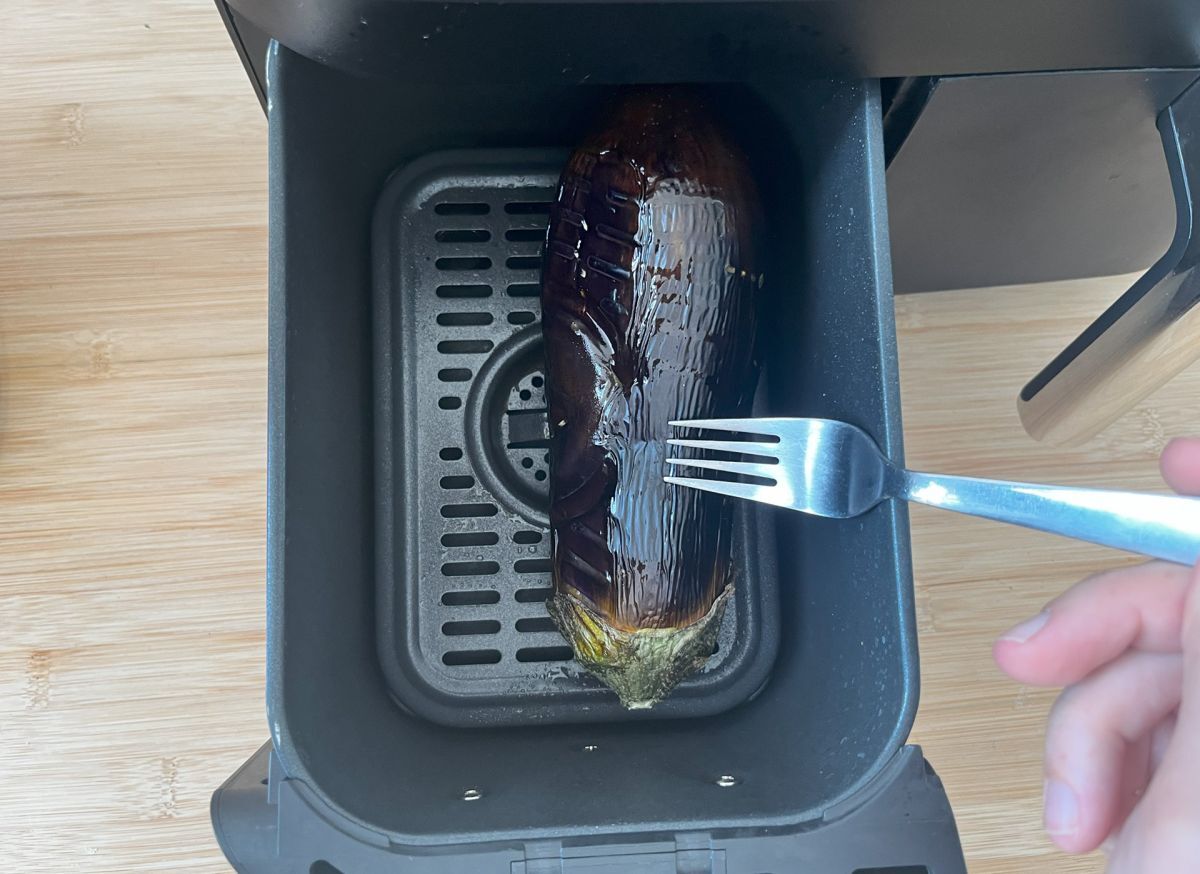 Lavate la melanzana, asciugatela e bucatela con i rebbi della forchetta. Sistematela nel cestello della friggitrice ad aria e spennellate la buccia con olio d'oliva (o spruzzare con olio spray). Quindi cuocete in modalità "Air Fry" per 20 minuti a 180°C, girandola a metà cottura.