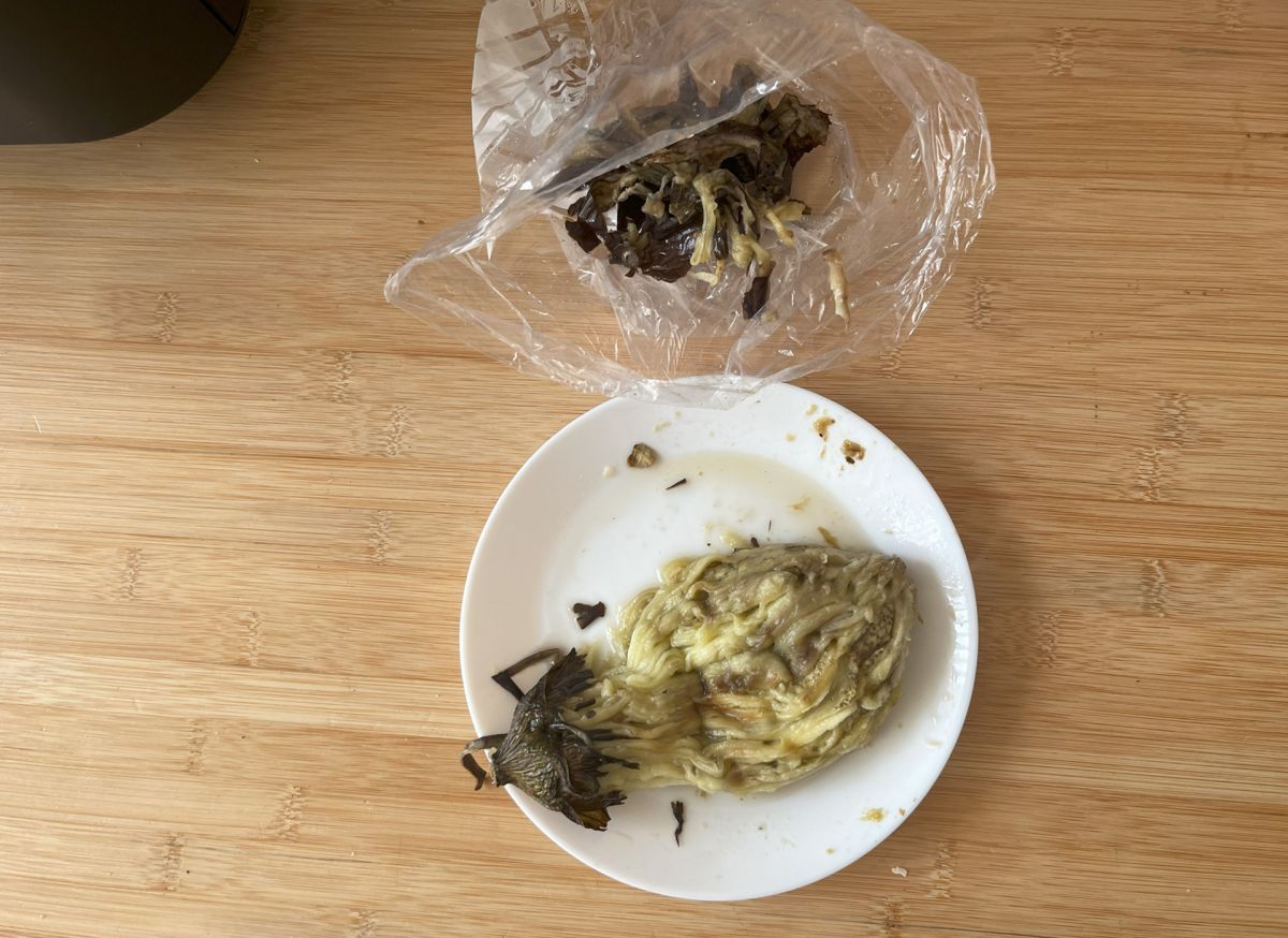 Passato questo tempo, togliere la melanzana dalla friggitrice ad aria e mettetela in un sacchetto freezer sigillato per 10 minuti. A questo punto trasferite la melanzana in un piatto e rimuovete la buccia aiutandovi con due forchette