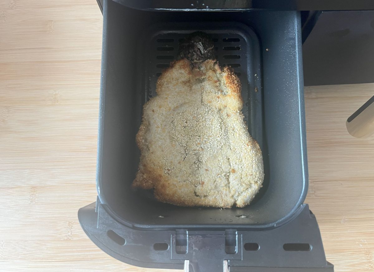 Ingrassate il cestello della friggitrice ad aria (andrà benissimo anche l'olio spray) e e sistemate la melanzana panata. Cuocere in modalità "Maxi Crisp" a 230°C per 10 minuti. Girate la melanzana e continuate la cottura per altri 8 minuti alla stessa temperatura