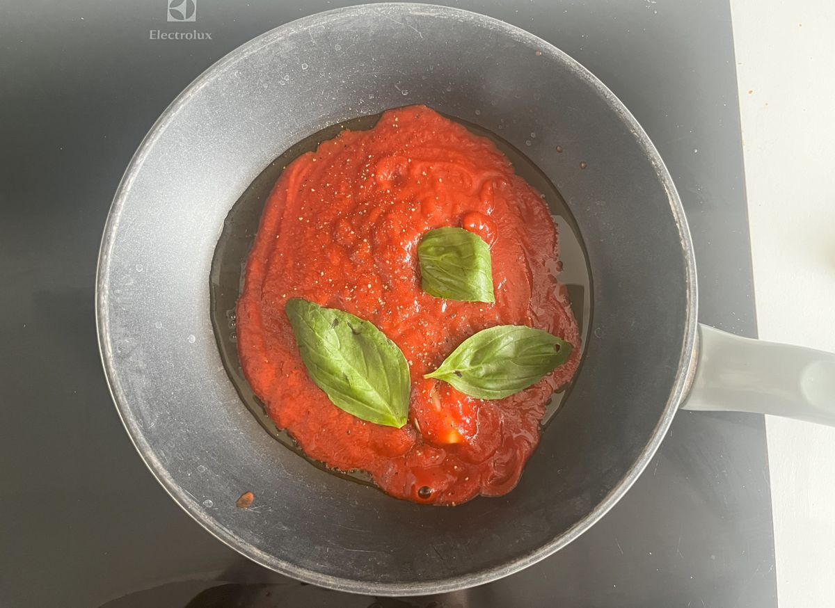 Nel frattempo preparate la salsa di pomodoro. Versate un filo d'olio d'oliva in una padella e aggiungere uno spicchio d'aglio schiacciato. Aggiungere la passata di pomodoro, il sale, il pepe e qualche foglia di basilico. Quindi cuocere a fuoco lento per 10 minuti mescolando di tanto in tanto