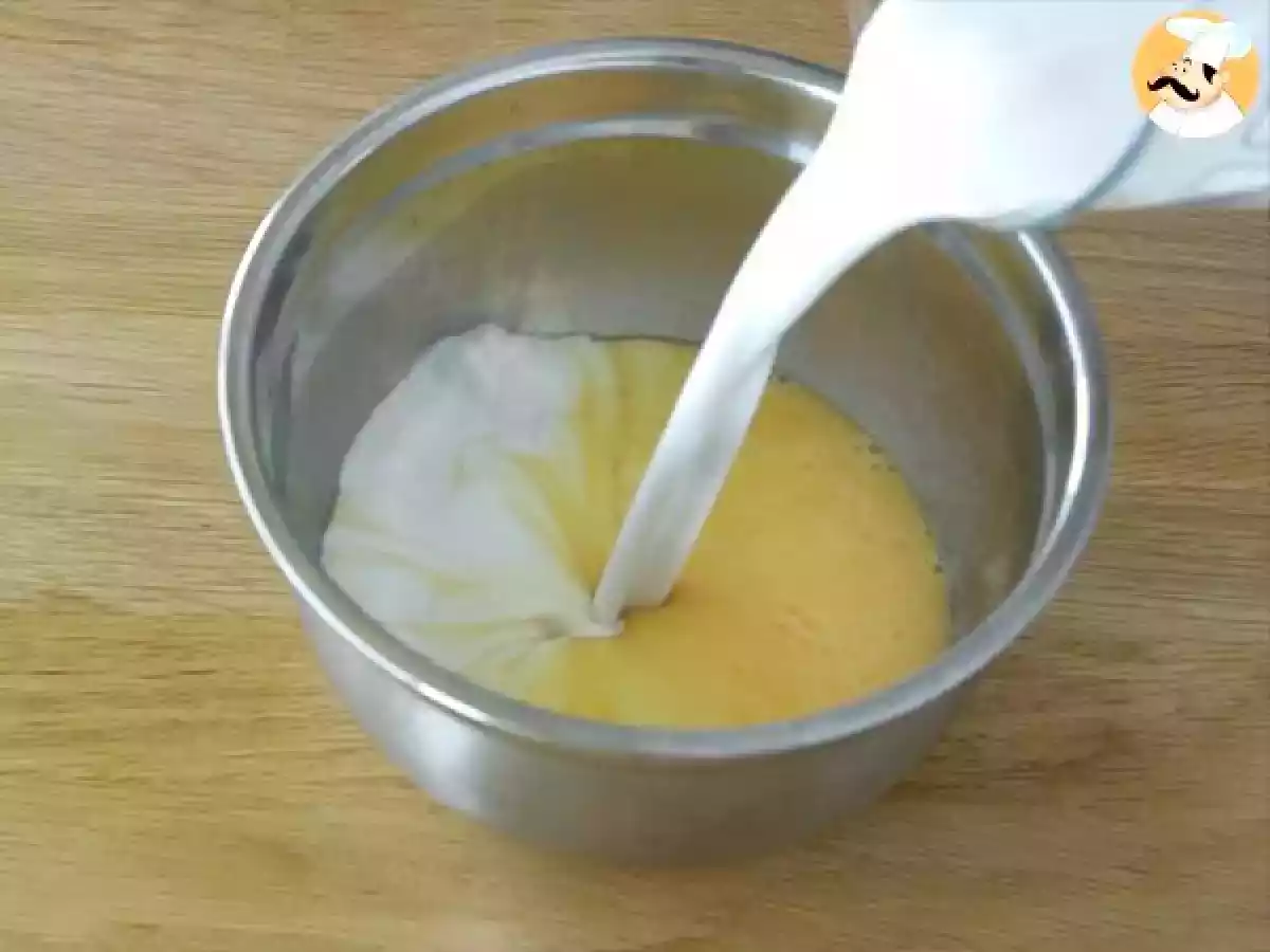 Mescolate in una ciotola 200 ml di latte di cocco, 200 ml di latte condensato, 4 uova e 50 gr di cocco grattugiato.