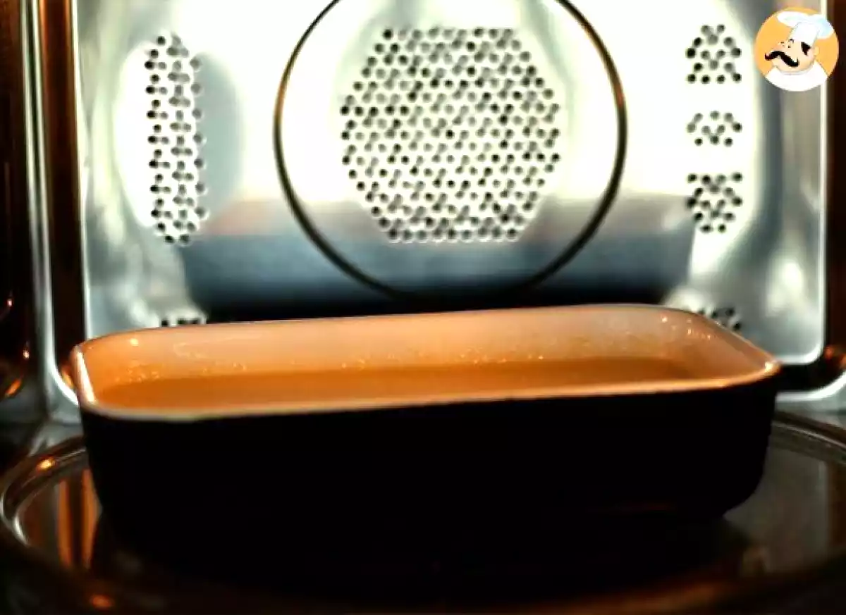 Mettete 70gr di zucchero ed un po' d'acqua in un pentolino a fuoco medio. Lasciate in cottura fin quando si forma il caramello. Quando è pronto versatelo immediatamente sulla base di una stampo adatto al microonde.