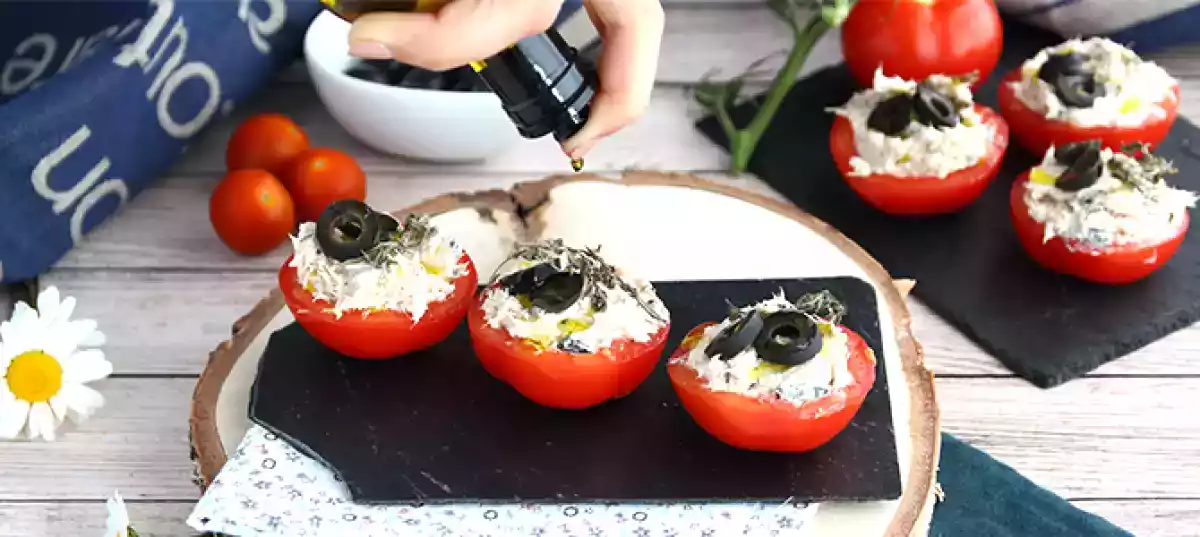 Pomodori ripieni con tonno, formaggio fresco e olive nere