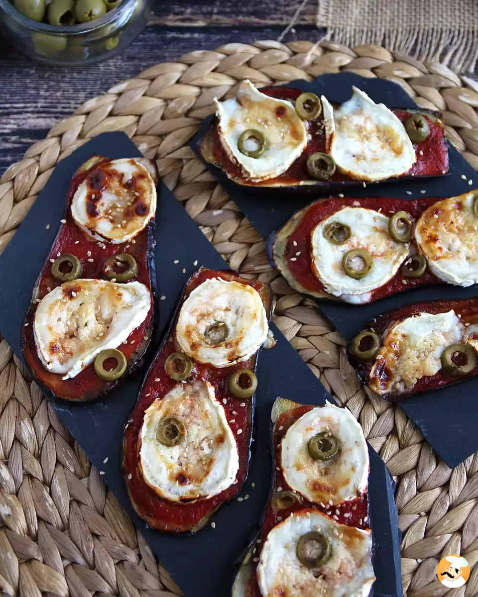 Bruschette di melanzane con pomodoro, olive e formaggio