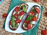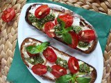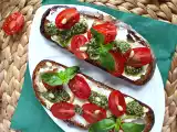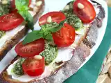Bruschetta con pesto, pinoli, formaggio fresco e pomodorini