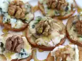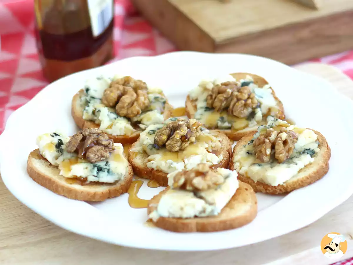Un a bbinamento classico ed elegante, perfetto per chi apprezza il contrasto tra dolce e salato. Iniziate tostando leggermente le fette di pancarré, poi spalmatevi un generoso strato di gorgonzola cremoso. Aggiungete infine le noci tritate per un tocco di croccantezza. Per completare il piatto, un filo di miele versato sopra dona una nota dolce che esalta magnificamente i sapori, creando un equilibrio perfetto. Foto della ricetta: Crostini al Roquefort, noci e miele