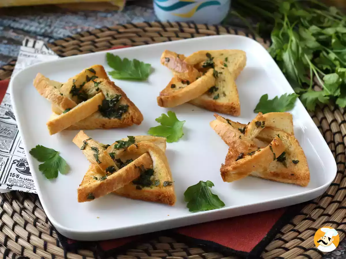 Un grande classico della tradizione francese rivisitato con creatività. Tagliate le fette di pancarré a forma di stella e spalmatele con un mix d i burro fuso, aglio e prezzemolo. Infornatele finché non diventano dorate e croccant i, per un risultato perfetto. Questi stuzzichini sono ideali come accompagnamento a zuppe fumanti o, semplicemente, come uno snack da aperitivo. Foto della ricetta: Pane all'aglio a forma di stella