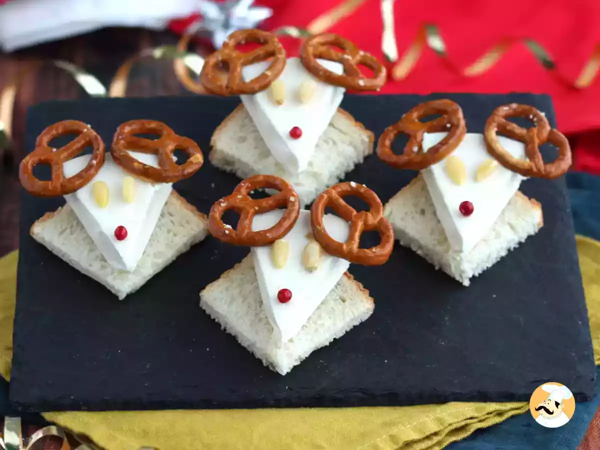 Perfetto per i bambini ( ma non solo). Per creare la base della renna, utilizzate dei formaggini e disponeteli su fette di pancarré tostato. I pretzel diventeranno le corna, le olive serviranno per gli occhi e un pomodorino per il naso. Un'idea divertente e gustosa, che renderà ogni piatto ancora più s peciale e creativo. Foto della ricetta: Renna di Natale con formaggio