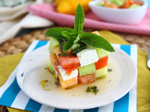 Visual food per far colpo su tutti gli ospiti al party in piscina. La nostra sfiziosa idea è un' insalata cubo di Rubik preparata con frutta, ortaggi e feta: un piatto fresco e saporito che può essere consumato anche dagli amici vegetariani.