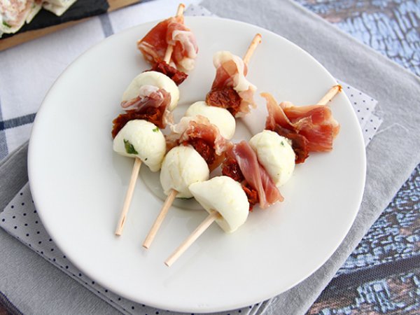 Idea last minute, un classico da buffet che piace a tutti. Provate i nostri gustosi spiedini con bocconcini di mozzarella, prosciutto crudo e pomodori secchi. Un abbinamento equilibrato e leggero, un piatto senza cottura che si può modificare in base ai proprio gusti.