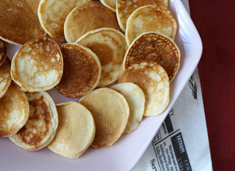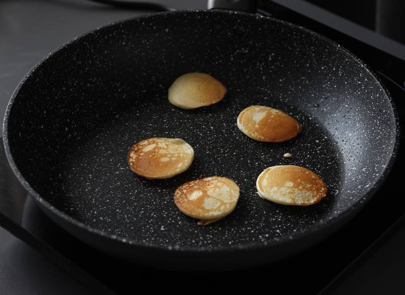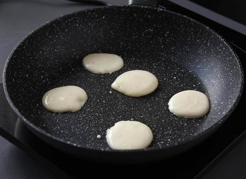 Quando sull'impasto iniziano a formarsi delle bolle in superficie, è il momento di girare i blinis per consentire una cottura uniforme su entrambi i lati.
