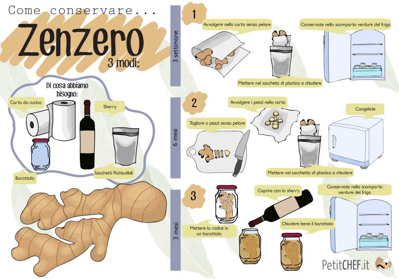 - Per una conservazione breve (massimo 3 settimane) basta avvolgere la radice di zenzero non pelata nella carta assorbente (tipo Scottex), metterla in un sacchetto richiudibile e conservarla nello scomparto verdure del frigorifero