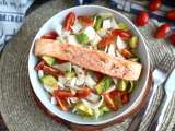 Ricetta facilissima, leggera e gustosa. L'insalata di accompagnamento potete sceglierla voi in base alle verdure di stagione che avete a disposizione, poi non vi resterà che seguire i nostri consigli di cottura per preparare il trancio di salmone al forno e la cena è servita!