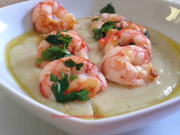 Gamberoni arrostiti su crema di fave