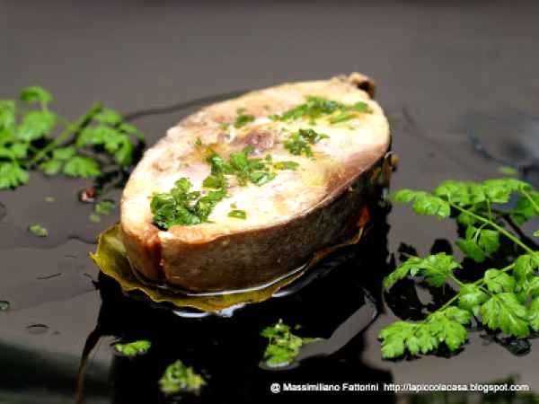 Trancio di palamita alla piastra su foglia di limone con emulsione olio evo e cerfoglio