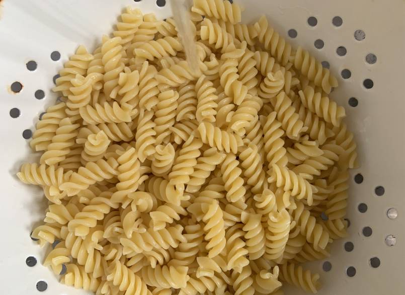 Come prima cosa si cuoce la pasta in acqua salata. Si scola al dente e si passa sotto l'acqua fredda per bloccare la cottura. Quindi si mette da parte.