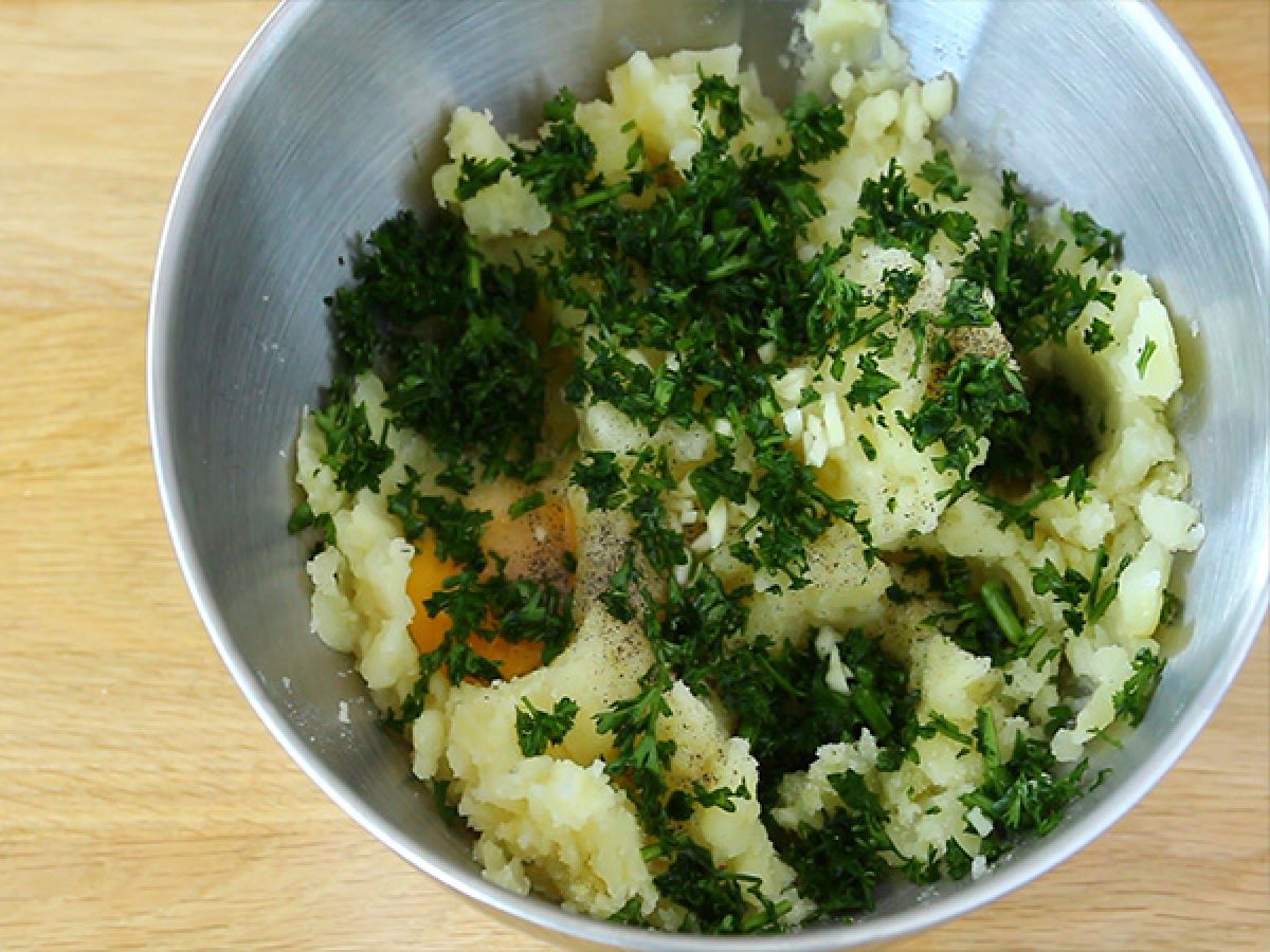 Sbucciare le patate una volta raffreddate e ridurle in purea. Aggiungere le uova, l’aglio tritato e il prezzemolo. Mescolare accuratamente fino a ottenere un composto omogeneo.