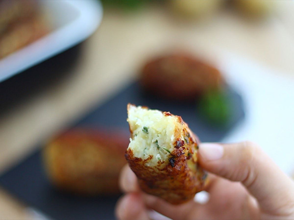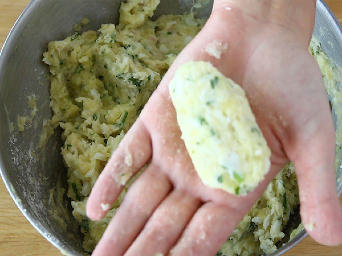 Prelevare l’impasto con un cucchiaio e modellarlo con le mani fino a ottenere crocchette o quenelle dalla forma allungata.