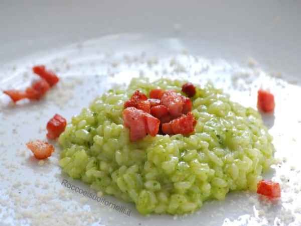 Risotto con crema di piselli e pancetta