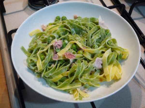 Paglia e fieno con piselli e prosciutto