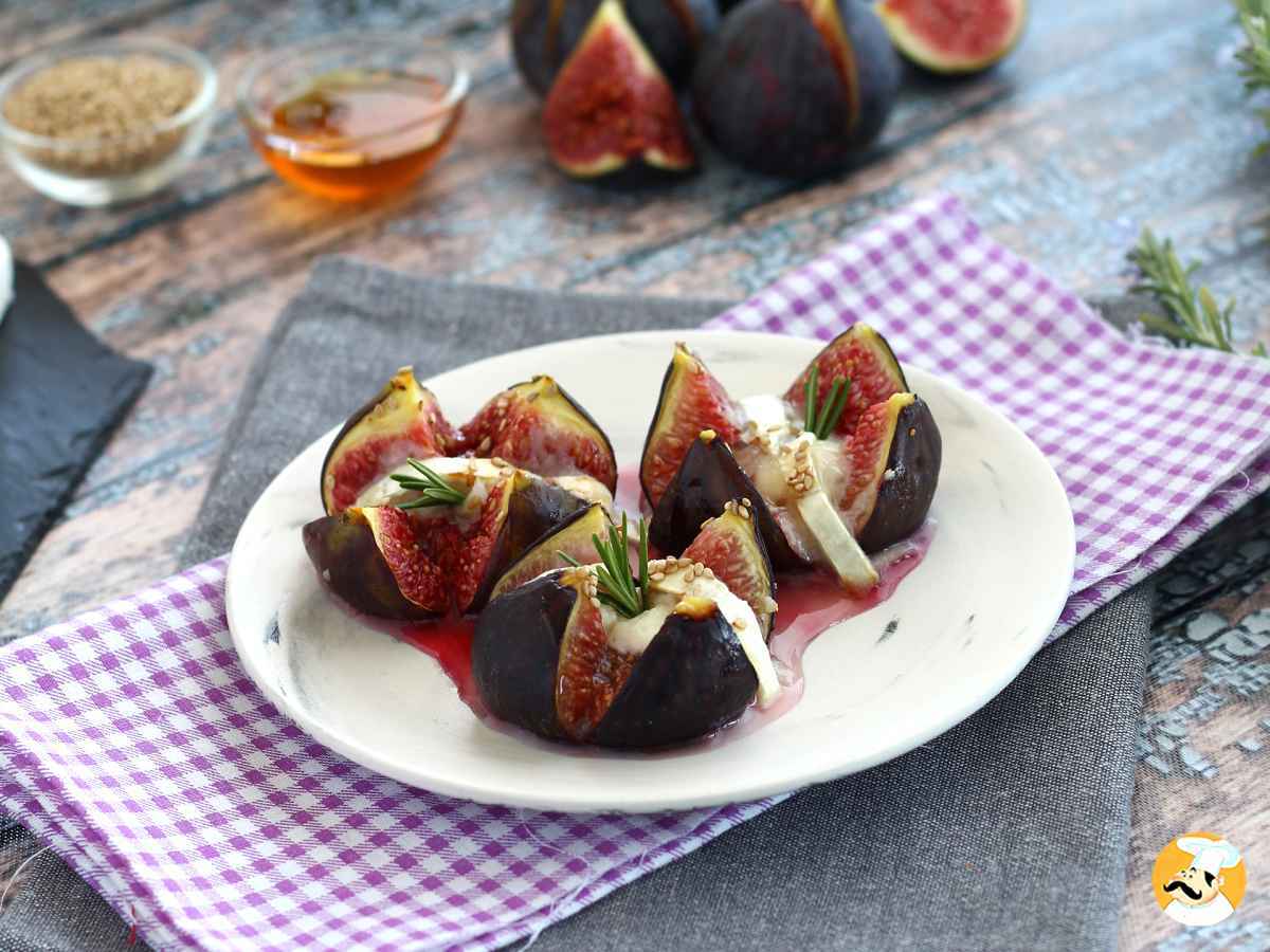 • Aggiungere in ogni fico un pezzo di caprino, un filo di miele e un po' di rosmarino.
