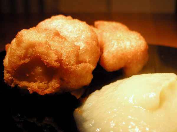 Gamberi e capesante in pastella di ceci con crema di finocchi