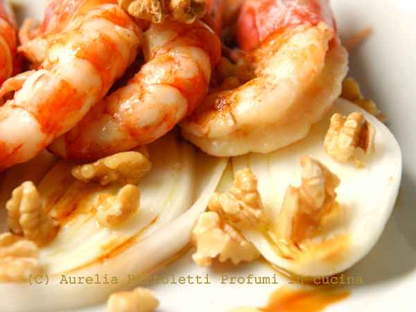 Gamberi al vapore, aromatizzati al timo, su letto di cipolle di tropea e noci
