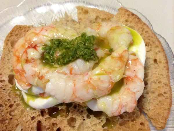 Tortino di gamberi bufala e olio al basilico