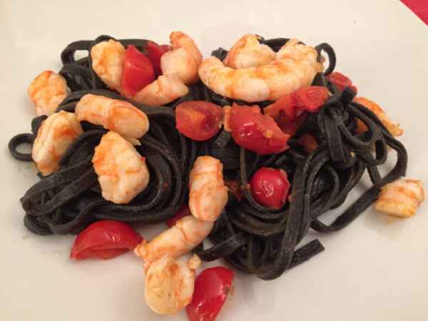 Tagliolini al nero di seppia con gamberi e pomodorini pachino