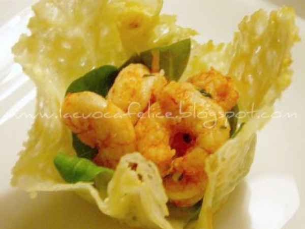 Cestini di parmigiano con gamberi e maionese bianca al gorgonzola