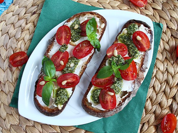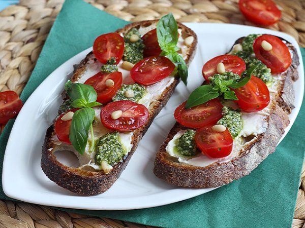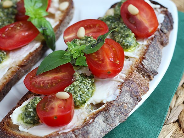Bruschetta con pesto, pinoli, formaggio fresco e pomodorini