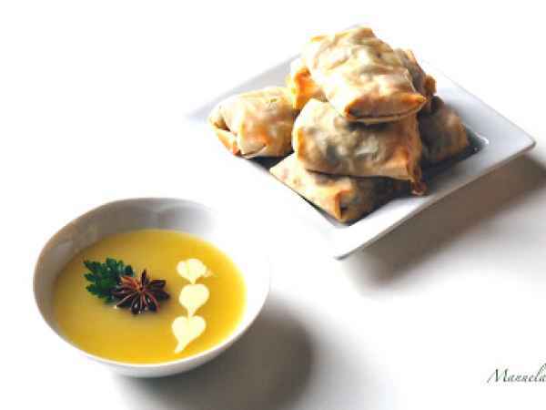 Strudel di verdure e soia su passatina di porri e anice stellato.