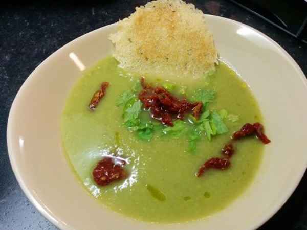Vellutata di sedano e piselli profumata allo zenzero con cialda di grana e pomodori secchi