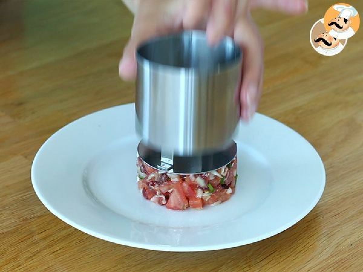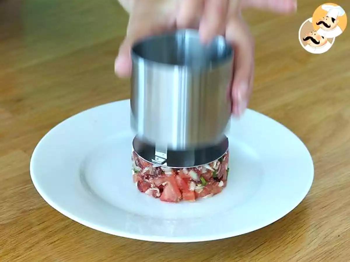 Se non avete un cerchio in metallo, mettete semplicemente la tartare in un piatto piano da servizio e ricavate la formo che desiderate.