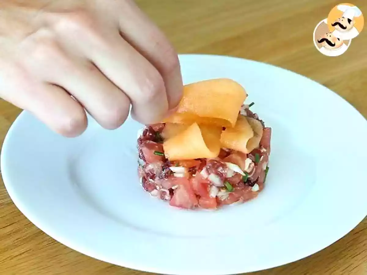 Tagliate il melone a fette sottili e disponetele sulla parte superiore della vostra tartare.