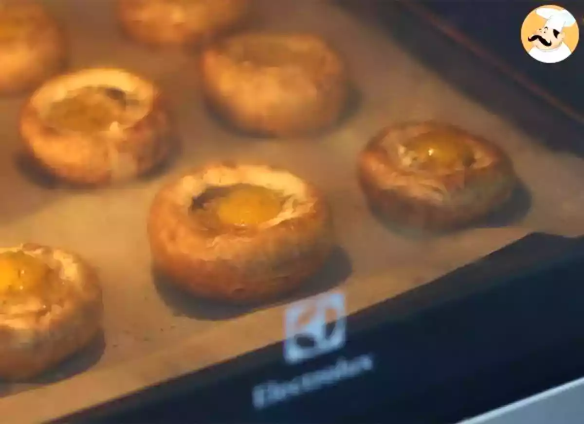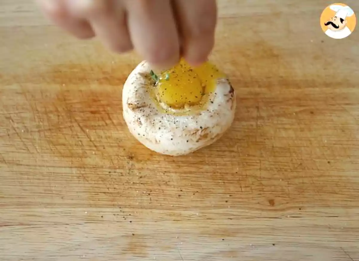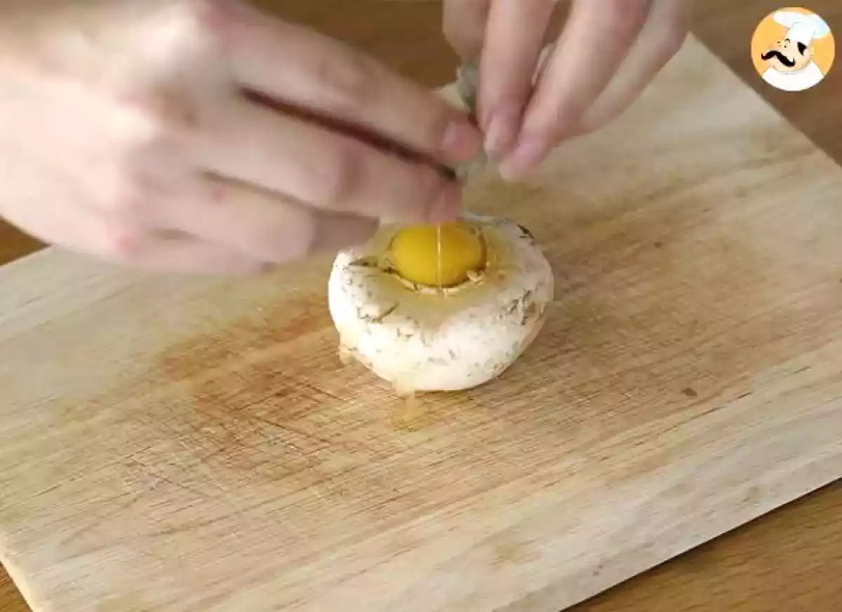 Adesso rompi delicatamente l'uovo di quaglia e versa il contenuto nella parte concava del fungo