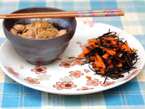 Pollo saltato con germogli ed insalata di alghe e carote... japan style! Portata principale Portata principale