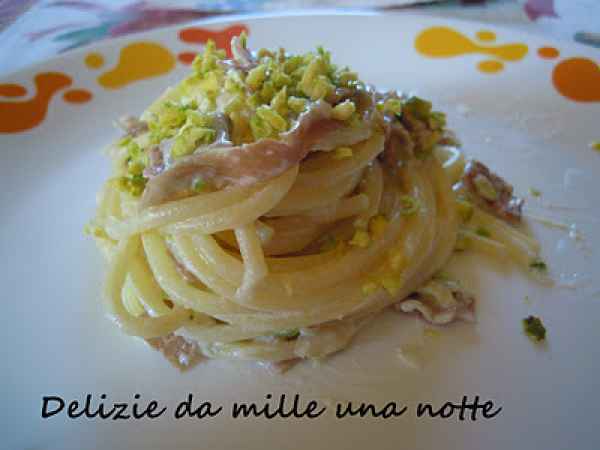 Spaghetti con speck e pistacchi
