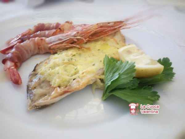 Filetto di orata al forno in crosta di patate con code di gamberi avvolti nello speck