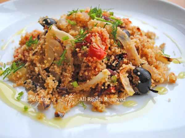 Couscous vegetariano con finocchi, pomodorini cilegia e olive nere